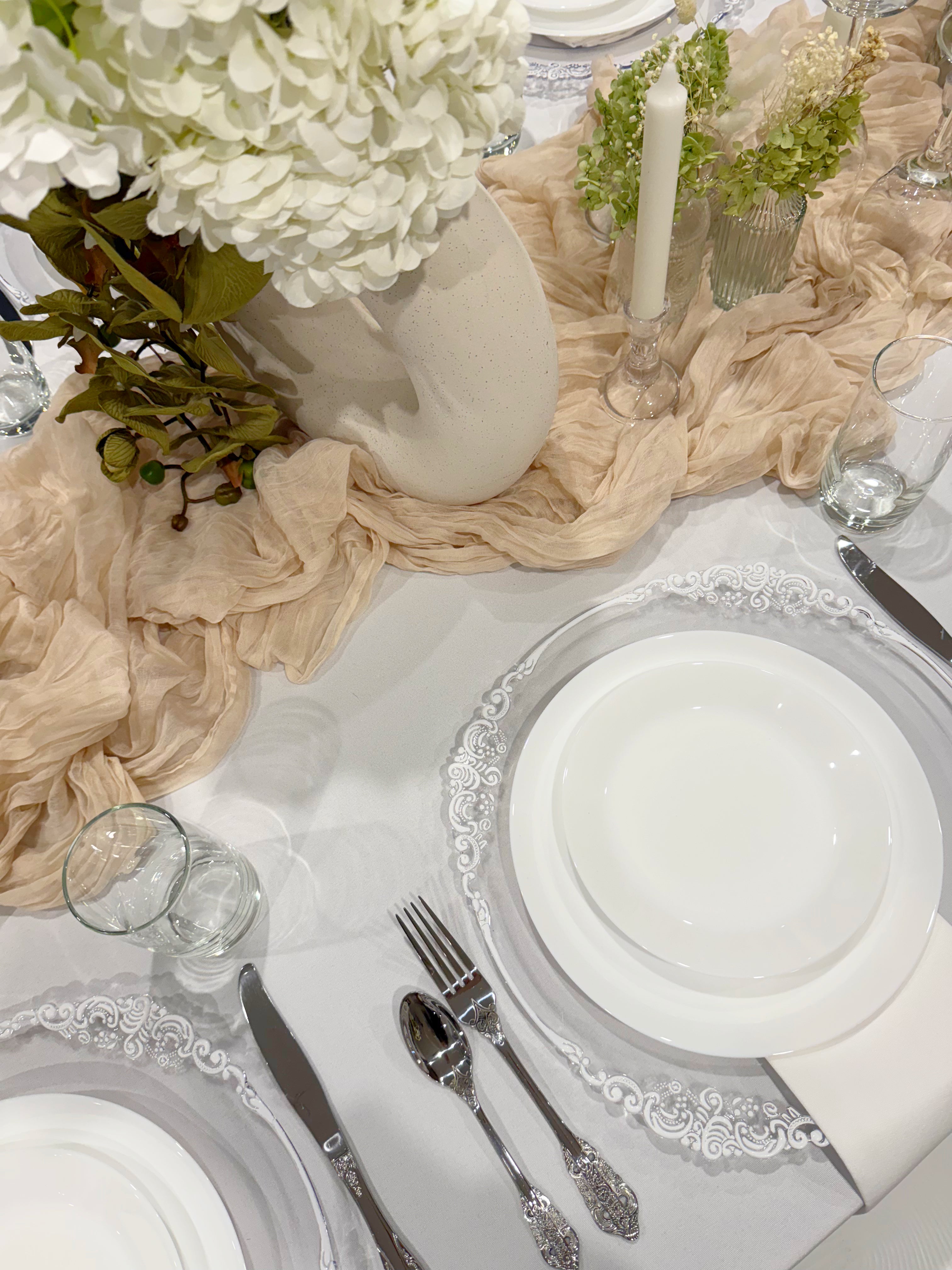 Close up of our vintage charger plates, beige runners and neutral florals, creating a blended texture and tone for a timeless wedding.
