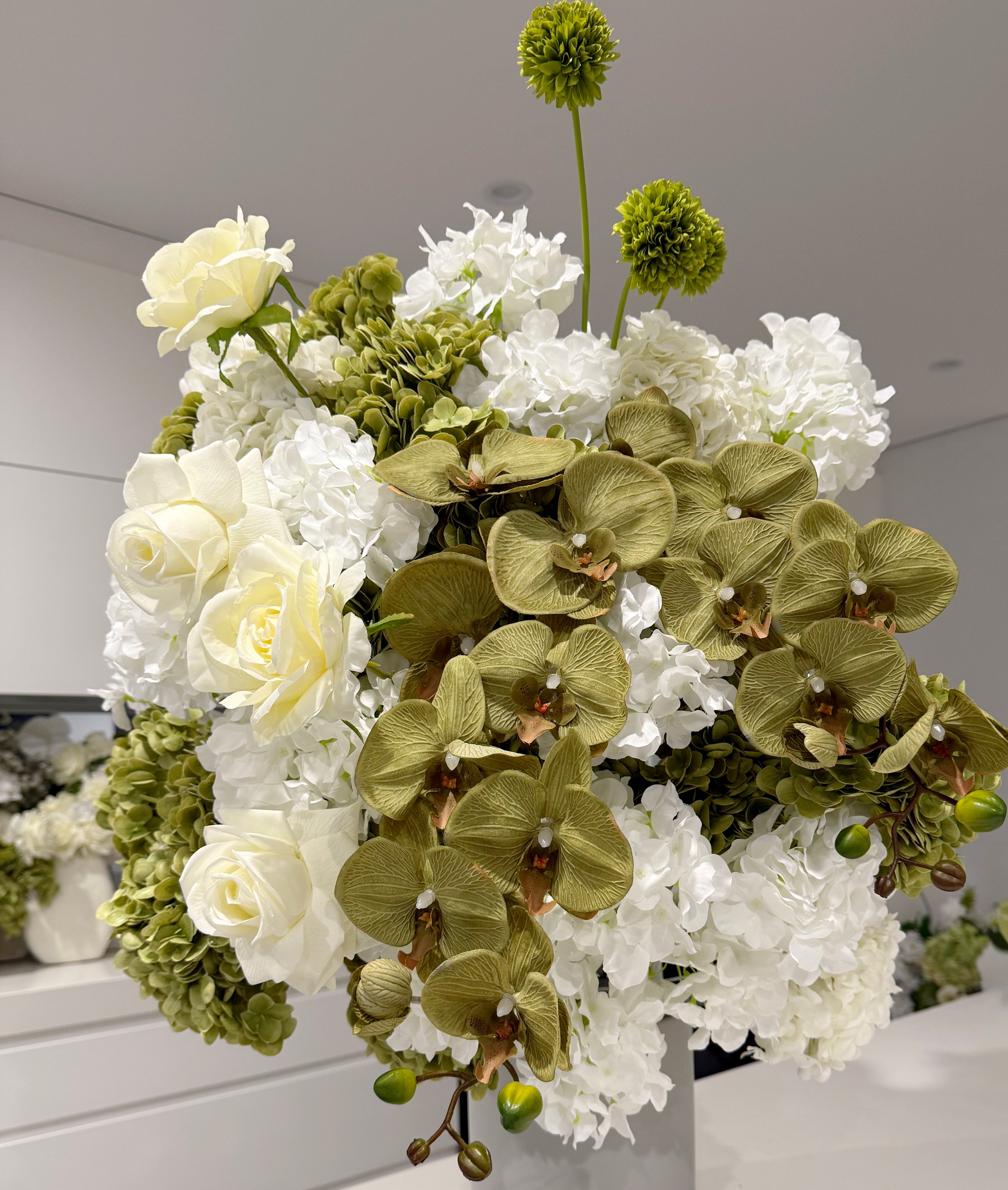 A lush mix of white hydrangeas, roses and green orchids centerpiece.