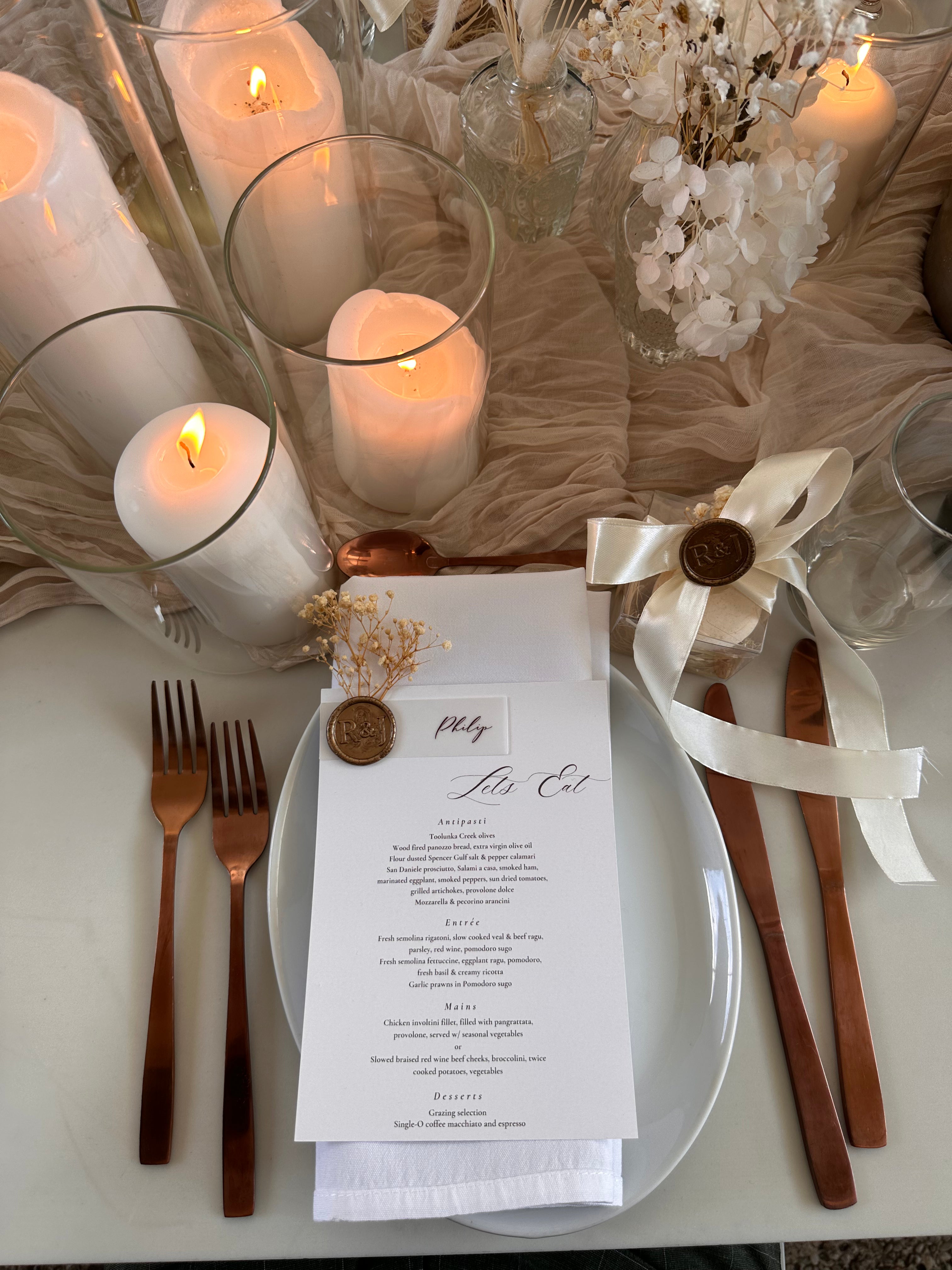 This set up features our in house designed menus finsihed with wax seals, paired with gold-toned cutlery. Every element from the soft draping to the bomboniere was thoughtfully styled.