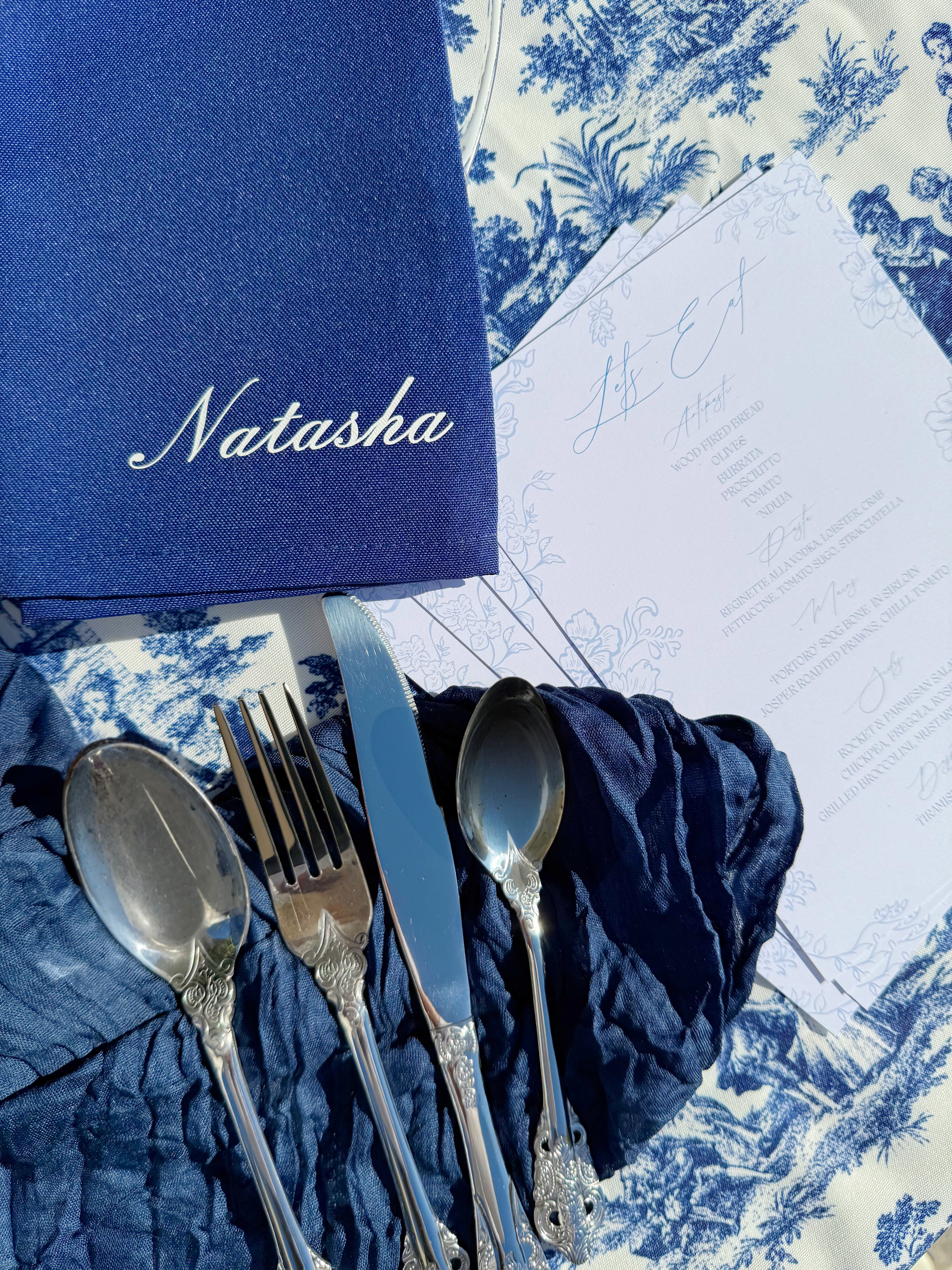 Blue China inspiration - Custom table cloth and personlised napkins for each guest aswell as printed menus and antique styled cutlery to bring this vision to life.