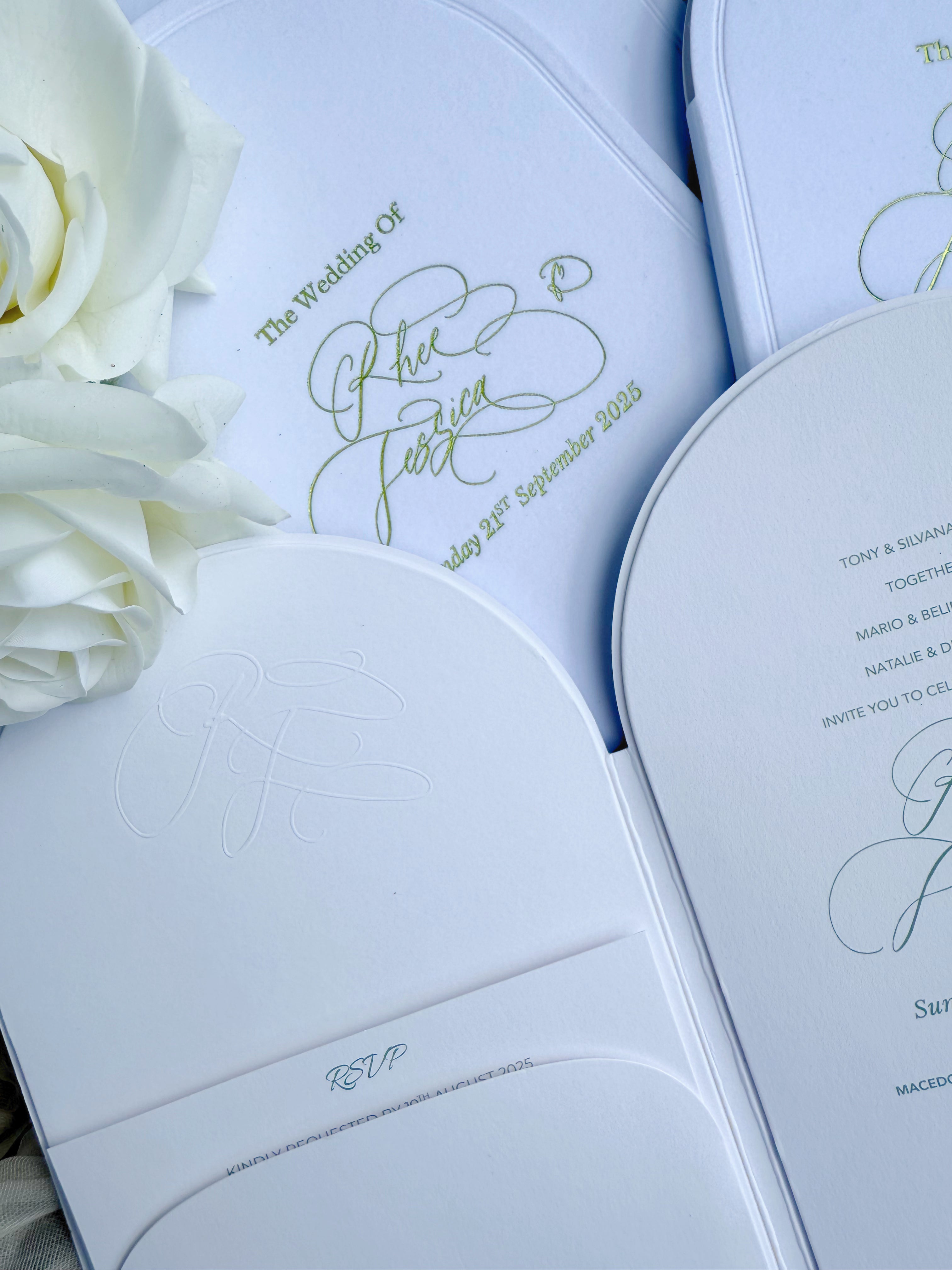 Custom velvet invitations with sage foiling. These inviations reflect Amoras love for timeless designed and meaningful detail.