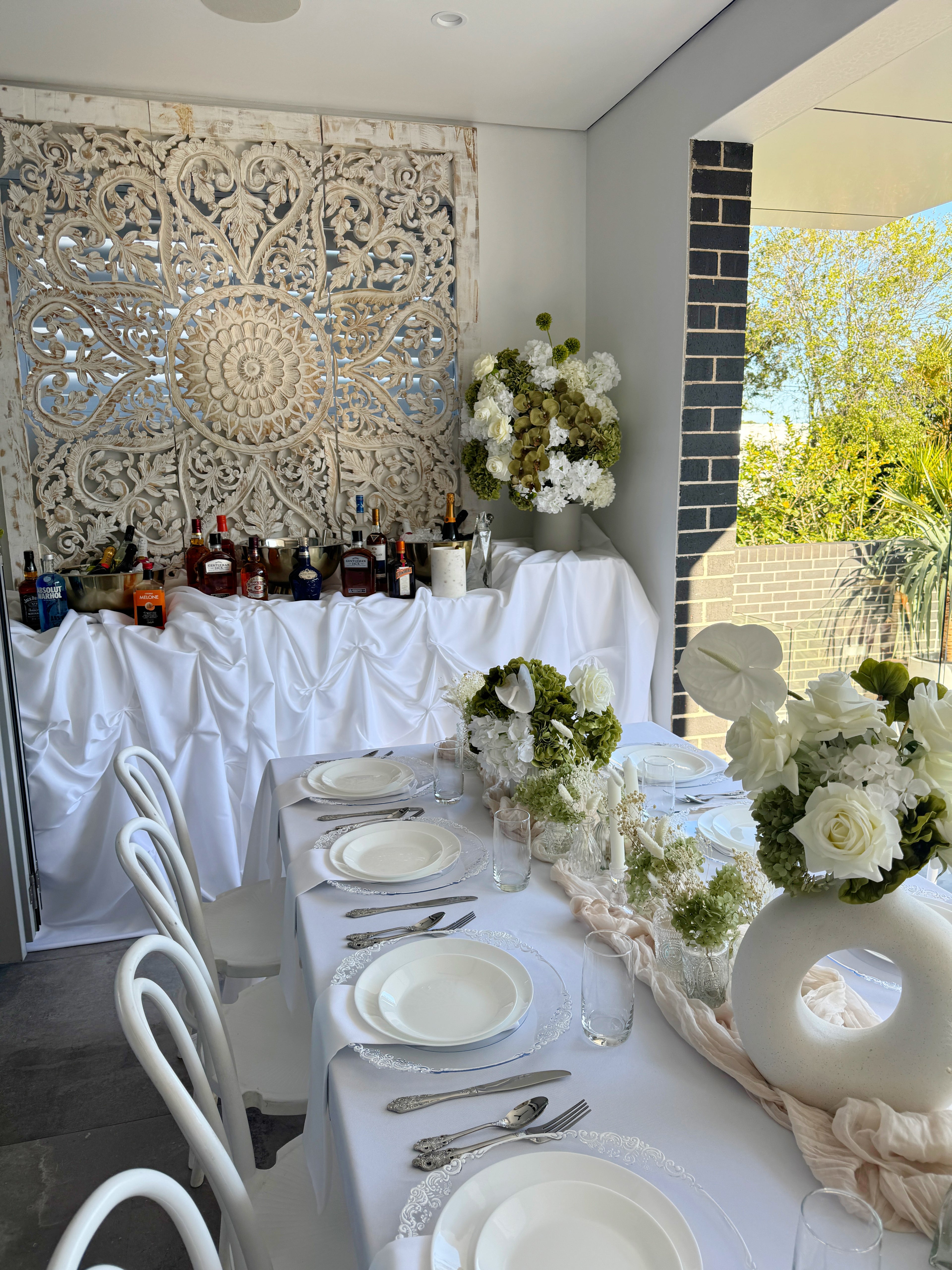 Our macedonian morning set up, this setup brings together everything we love. Layers of white and cream florals, textured bar draping.